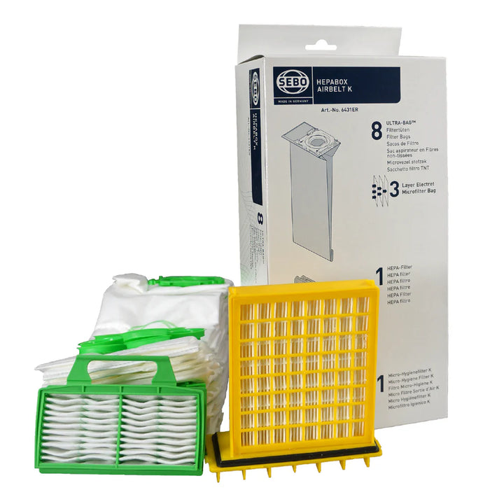 The SEBO K-Series HEPA Service Box includes 8 AeraPure™ filter bags, a HEPA pre-motor microfilter, and an exhaust filter. The HEPA-grade microfilter provides enhanced filtration, ideal for those with severe allergies or asthma, while the exhaust filter blocks microscopic particles from re-entering the air.